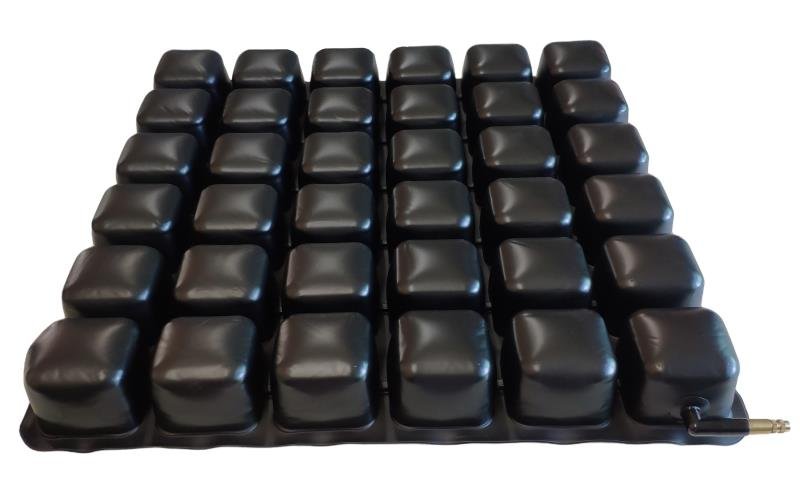 Cojín inflable diseñado especialmente para prevenir la aparición de escaras. Disminuye los puntos de presión mantenidos por períodos prolongados de tiempo, distribuye el peso recibido en sus 36 celdas de aire interconectadas.