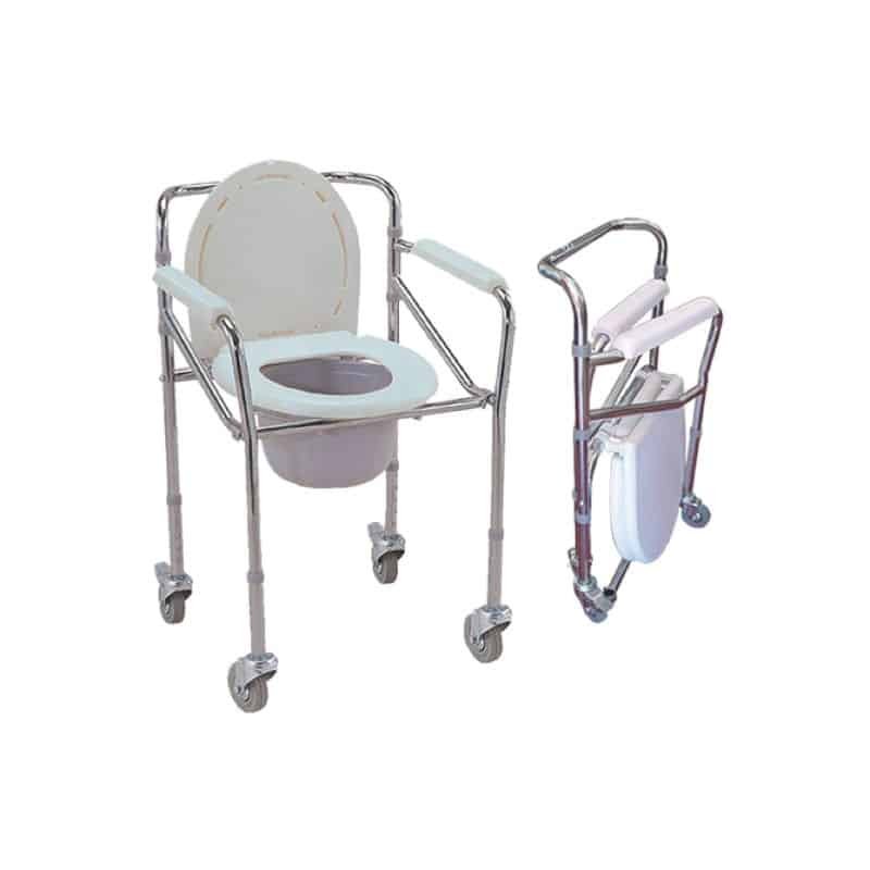 Baño plegable transportable, con ruedas, de acero cromado, para uso domiciliario y de gran utilidad para personas con movilidad reducida. La Tapa, asiento y recipiente con tapa de material plástico de alta densidad