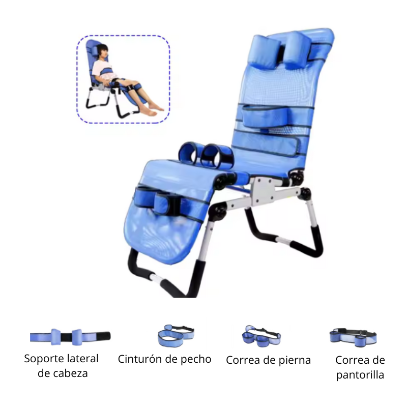 - Correas de posicionamiento seguras para cabeza, tronco, piernas y pantorillas.
