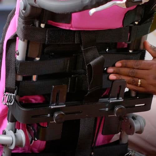 Esta silla cuenta con diferentes posibilidades de accesorios y además de permitir la reclinación de respaldo y basculación de asiento, para favorecer el posicionamiento adecuado en los diferentes contextos y acciones durante el día, aliviando la presión y soporte superior del cuerpo.
