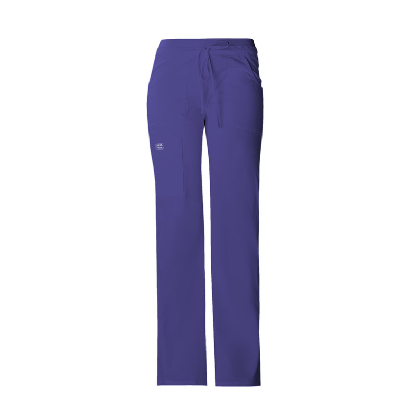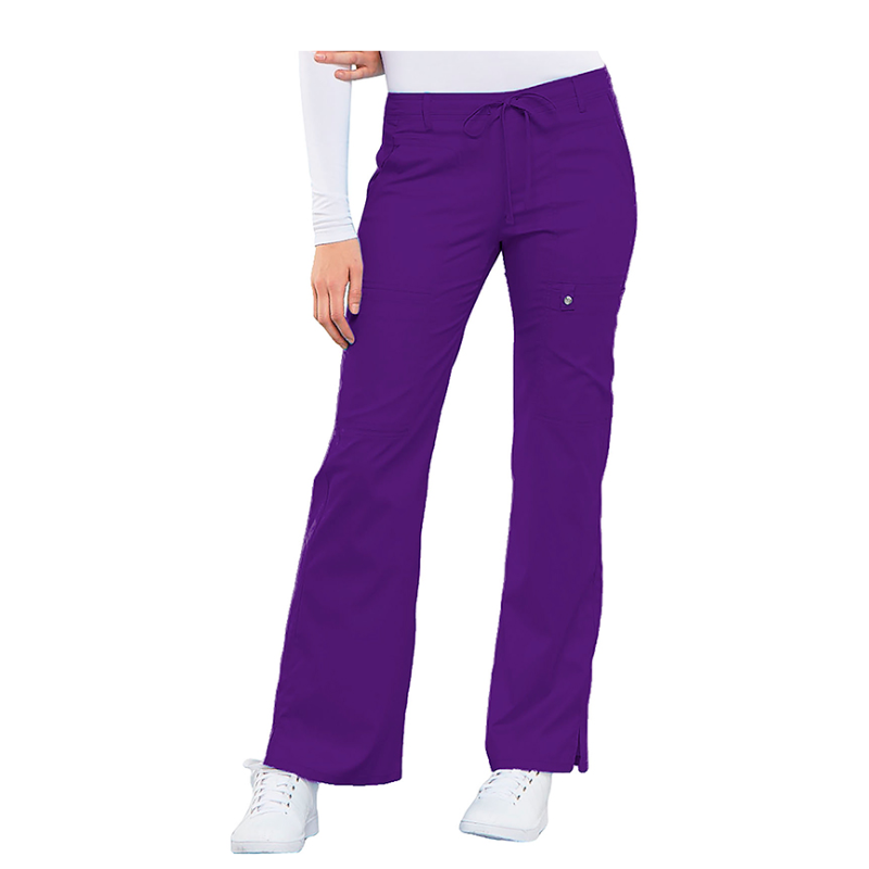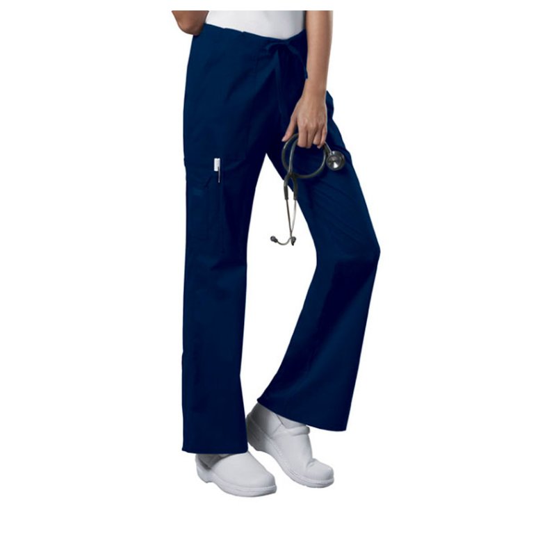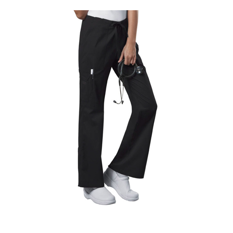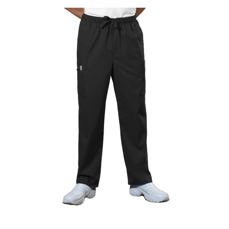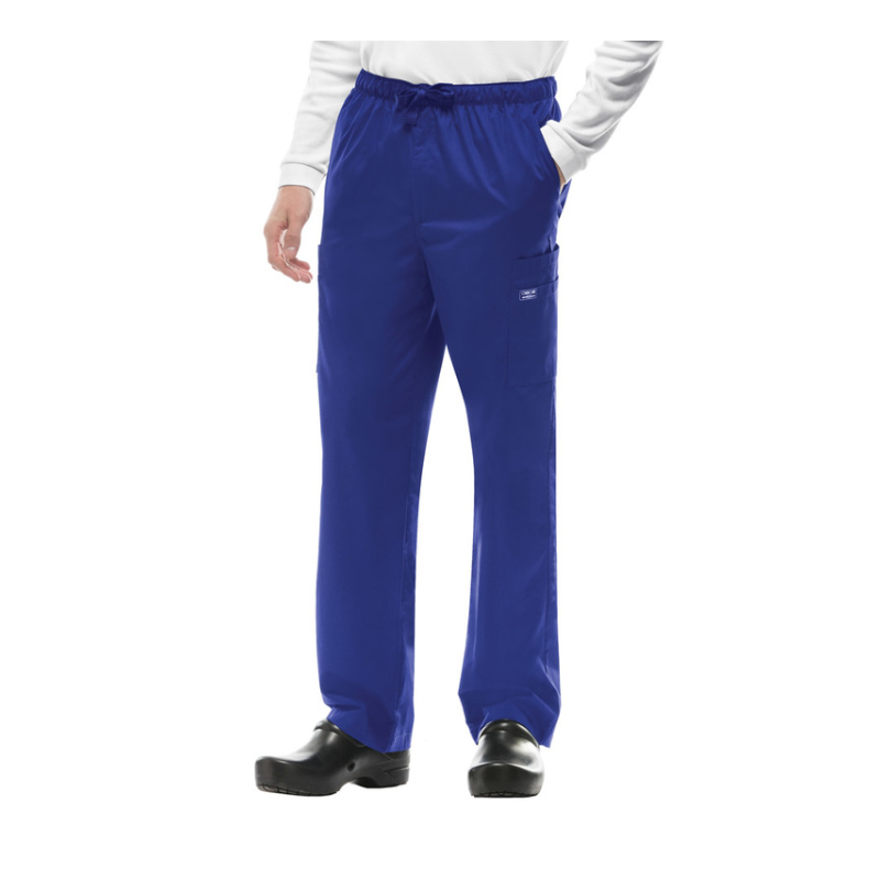 Pantalón clínico de hombre con cintura elásticada, con corte tradicional. Cuenta con cordón ajustable reforzado, una bragueta con cremallera funcional, dos bolsillos frontales en ángulo, cuatro bolsillos cargo laterales y un bolsillo trasero de parche con cierre de botón para mayor seguridad.