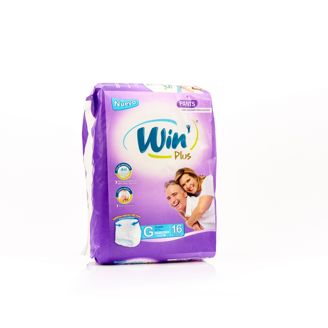 WIN PLUS PANTS es Un pañal diseñado para la comodidad diaria, con cubierta externa tipo tela que permite máxima protección y discreción, manteniendo la piel seca y protegida por más tiempo para Cualquier actividad diaria, con gel absorbente, barreras anti desbordes para mayor seguridad y cintura elástica para mayor comodidad.